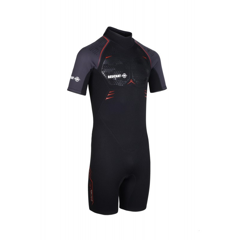 Гидрокостюм Beuchat Optima2 Shorty Man 3 мм является новым продуктом, который наверняка понравится всем любителям и дайверам, которые ищут высокопроизводительный костюм, предлагающий отличное соотношение цены и качества. Усиленная молния с внутренней подкладкой расположена вертикально сзади и снабжена длинной лентой для удобства использования. На груди вставка из прорезиненного неопрена. Она не впитывает воду, увеличивая теплоизоляцию и уменьшая трение об воду. Что делают эту модель популярной не только у дайверов , но и у любителей других видов спорта. Регулируемый шейный манжет выполнен из неопрена повышенной эластичности – Elaskin. Внутри он имеет глянцевую поверхность, что обеспечивает хорошее прилегание и максимальный комфорт. Плоские швы. В анатомическом крое использован принцип, когда швы не проходят в области подмышек, плечей - для достижения большего удобства и комфорта. Плечи на костюме выполнены в серой расцветке.