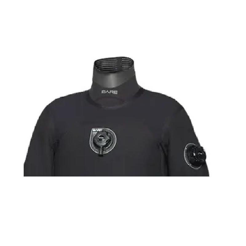 Сухий гідрокостюм Bare D 8 Pro Dry чорний виробництва Bare майже повністю аналогічний моделі CD4 ProDry, але виконаний з компресійного неопрена товщиною 8 мм, металізованого зсередини і покритого зовні нейлоном Diamont-Tuff. При виробництві костюма використовується унікальна технологія з'єднання деталей костюма NST (No Stitch Technology - безшовна технологія). Для підвищення довговічності ця модель має зносостійкі наколінники. Боти можуть бути виконані з 7 мм вулканізованого неопрена або з компресійного неопрена (Soft Boot). Клапан піддува обертається, що дозволяє використовувати лівосторонній або правосторонній підключення. Низькопрофільний травляче-запобіжний клапан виконаний регульованим.