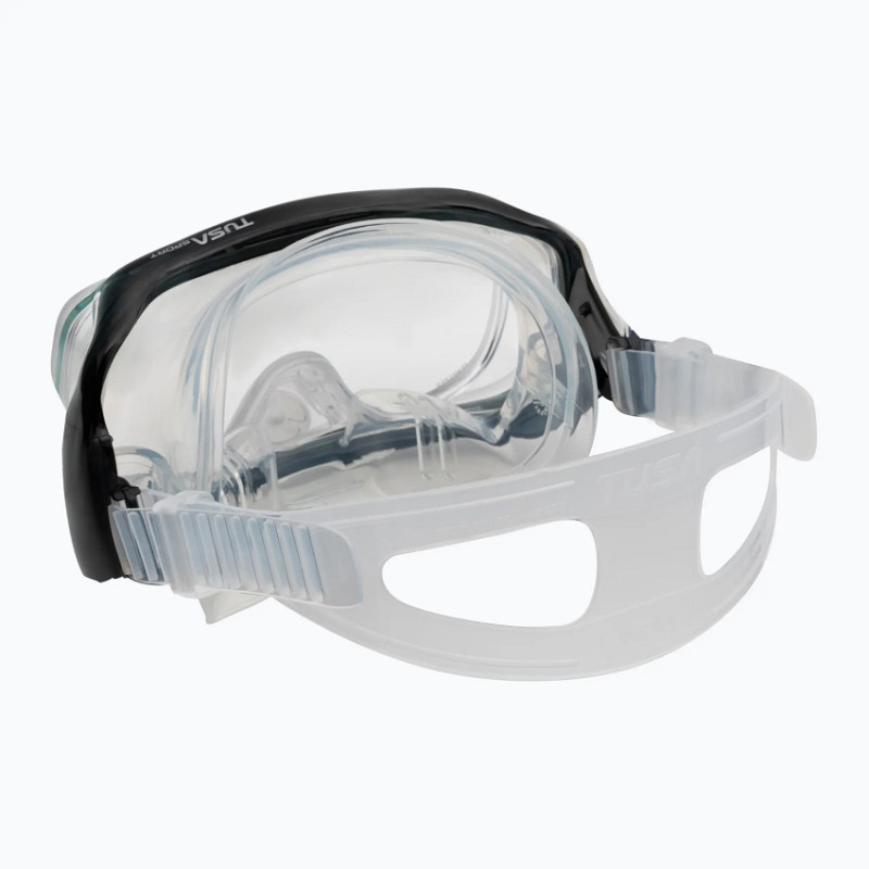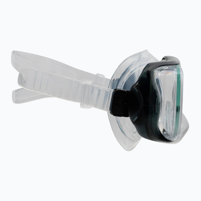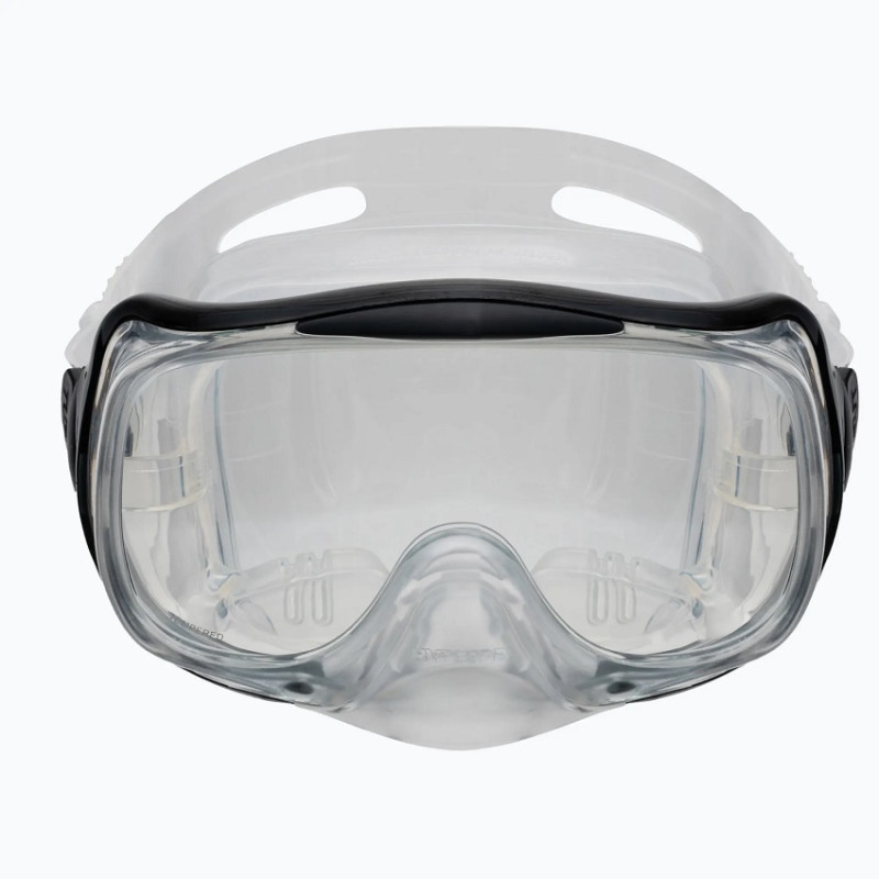 Односкляна лінза з двома бічними віконцями в масці збільшує поле зору і мінімізує оптичні спотворення під водою. Трилінзова конструкція гарантує широкий панорамний огляд і незмінну герметичність. Регульований ремінець і сучасна система кріплення пряжки забезпечують стабільне положення маски навіть під час динамічних рухів під водою.