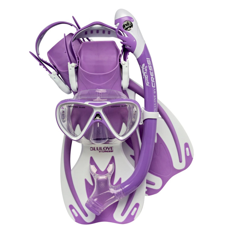 Набір дитячий Cressi-Sub ROCKS DRY SET лілово-білий складається з ластів, трубки і двоскляної маски з ілюмінатором, яка виконана із загартованого скла, що надає високу зносостійкість і достатню механічну міцність. Фланець маски виготовлений з прозорого силікону, а обойма з ударостійкої пластмаси. Фіксатор натягу потиличного ремінця спрощений. Також є фасонний виступ для носа. Регульований ремінець на ластах дозволяє використовувати ласти на сім розмірів. Лопаті ласт виготовлені з легкого, але в той же час ефективно відштовхуючого воду матеріалу, що гарантує плавний, не вимагає великих зусиль, але досить потужний гребок. Міцна петля у верхній частині п'яти дозволяє швидко регулювати положення фіксуючого ременя. Трубка з двома клапанами захищає від попадання води.